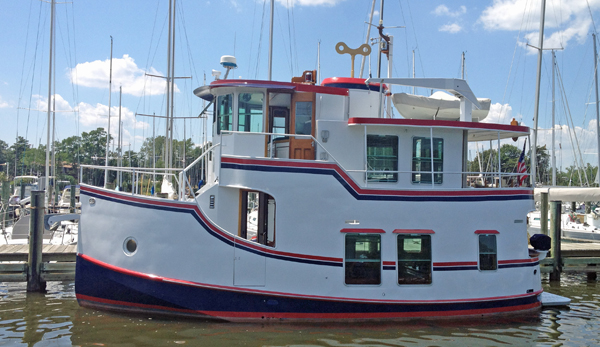 The versatility of WaterLilly is only limited by your imagination; make the Great Loop, coastal and intercoastal cruising, liveaboard, VRBO, or a waterfront office. She is a steel 35’ x 16, 1997 Florida Bay Coaster in excellent condition. Waterlilly was TWICE honored as Peoples’ Choice Best In Show winner at the Trawler Fests in 2005 and 2012. This award-winning Florida Bay Coaster is now available to delight her new owners! With a walk-around promenade, fore and aft decks, top of the boat with storage and a crane to lift or bring down the dingy, bright master bedroom on the upper level, second bedroom with two bunks, a pilot berth and a bright open space concept with a pullout sofa in the beautiful saloon/gallery. More than 6’ of headroom throughout.